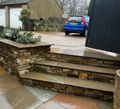 Sandstone sett driveway laid with natural colour variation and clean alignment. Built on a solid sub-base with correct levels for drainage, creating a durable surface that will weather and improve over time.