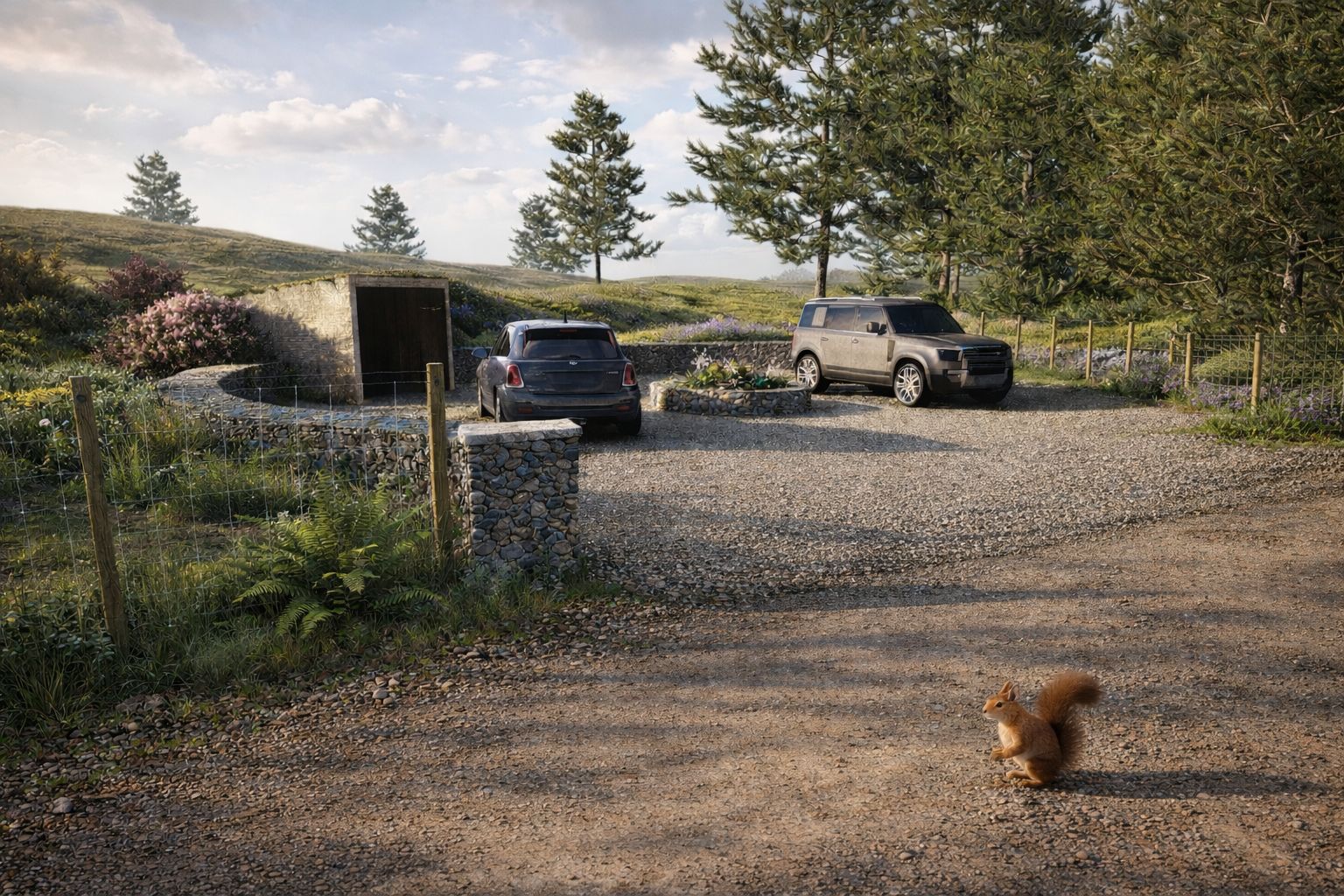 Designed and had approval granted for change of grassland into a small parking area and bike shed with green sedum roof.